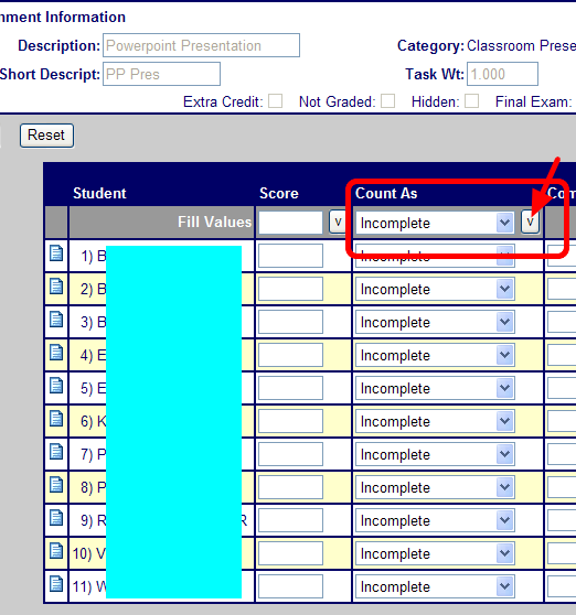 After you have set up the assignment, use the Fill Down option to give everyone an Incomplete.