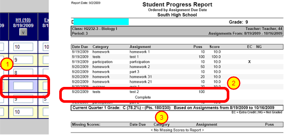2) The progress report shows that the student has completed the assignment, but if you look carefully in the calculation (3), you will see that the points were not included in the grade.