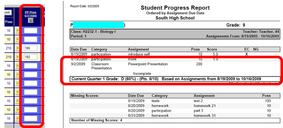 2) Progress reports will show the incomplete assignment, but will not include the points.