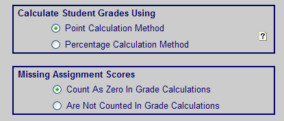 Some teachers enter the missing assignments and 'F' scores themselves - typing in the percentates that they want as the grades. If you do that, you do NOT need these Options. Use them for:
