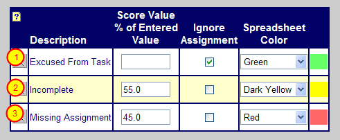 2) Incomplete - This could be used for any 'F' assignment. It is 'incomplete' because it was not satisfactory work (that's the closest term available in the list.) If you do everything on a percent basis, I would skip this and just type in 55% for my lowest 'F'. (Or any other score that you wish to use.) If you have assignments of many different point values, you might wish to do it this way so that the computer does the calculations.
