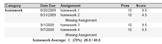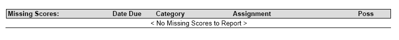Unfortunately, Zangle does not list these Missing Assignment under Missing Scores at the bottom of the report. Maybe we can have this included in a future implementation of Zangle.