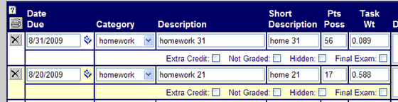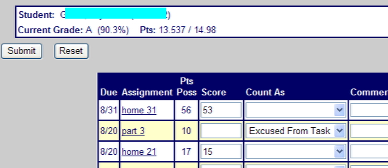 This means 15 points possible in the grade calculation. Unfortunately, Zangle only uses the decimal weight to the nearest thousandth place. Mathematically, this is fine, but it leaves untidy decimals floating around. (13.537/14.98). Just ignore them and go with the flow. (although if you use more than 5 points for your base value, your precision will go up.) [When I taught, I based all of my assignments out of 100 points, partly so I wouldn't have to deal with this sort of thing.]
